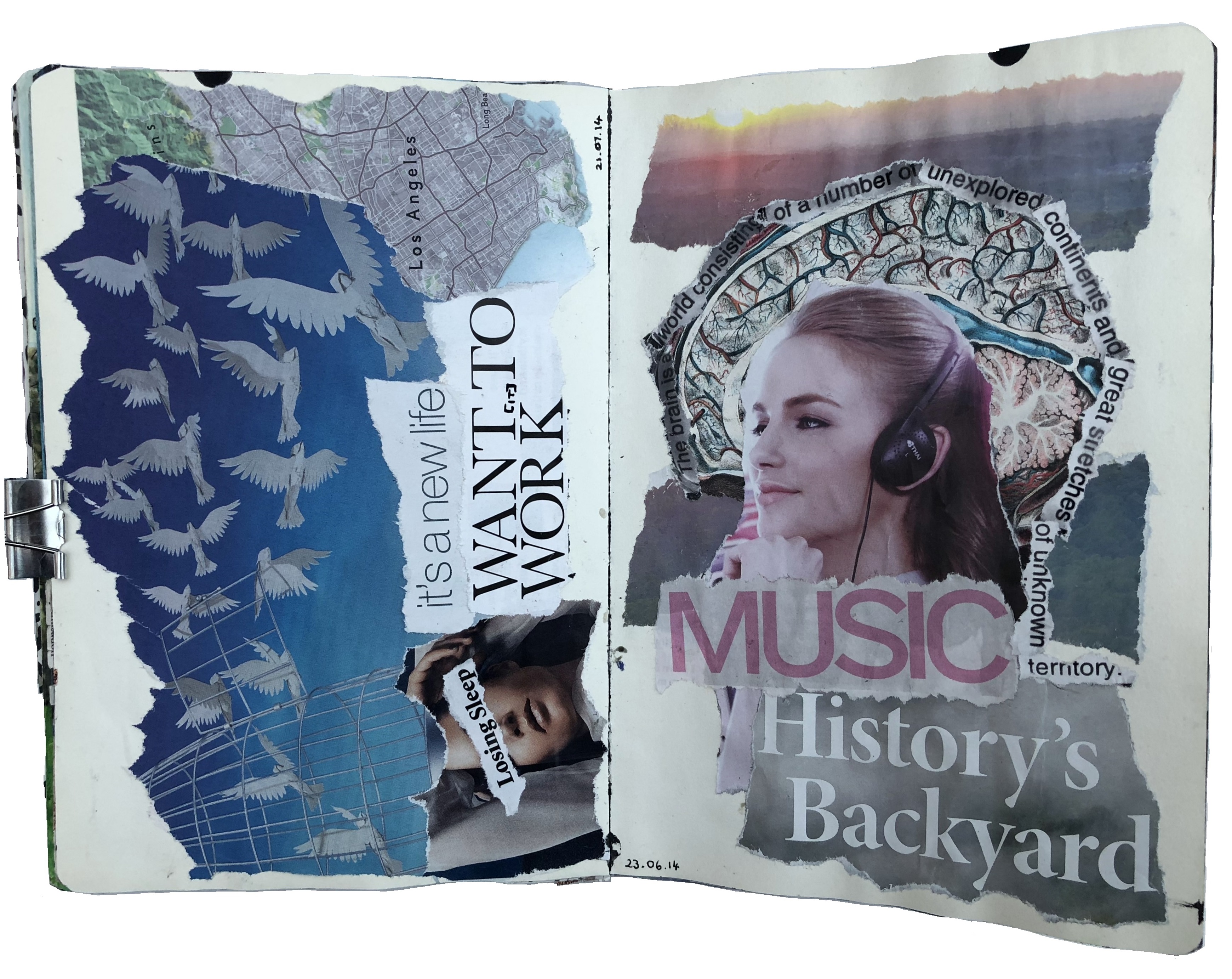 ×June 2014: A mixed media art journal collage of a woman with wires coming out of her head attached to a laptop while chained to a laptop with a dystopian background inspired by the St. Vincent song Digital Witness.
