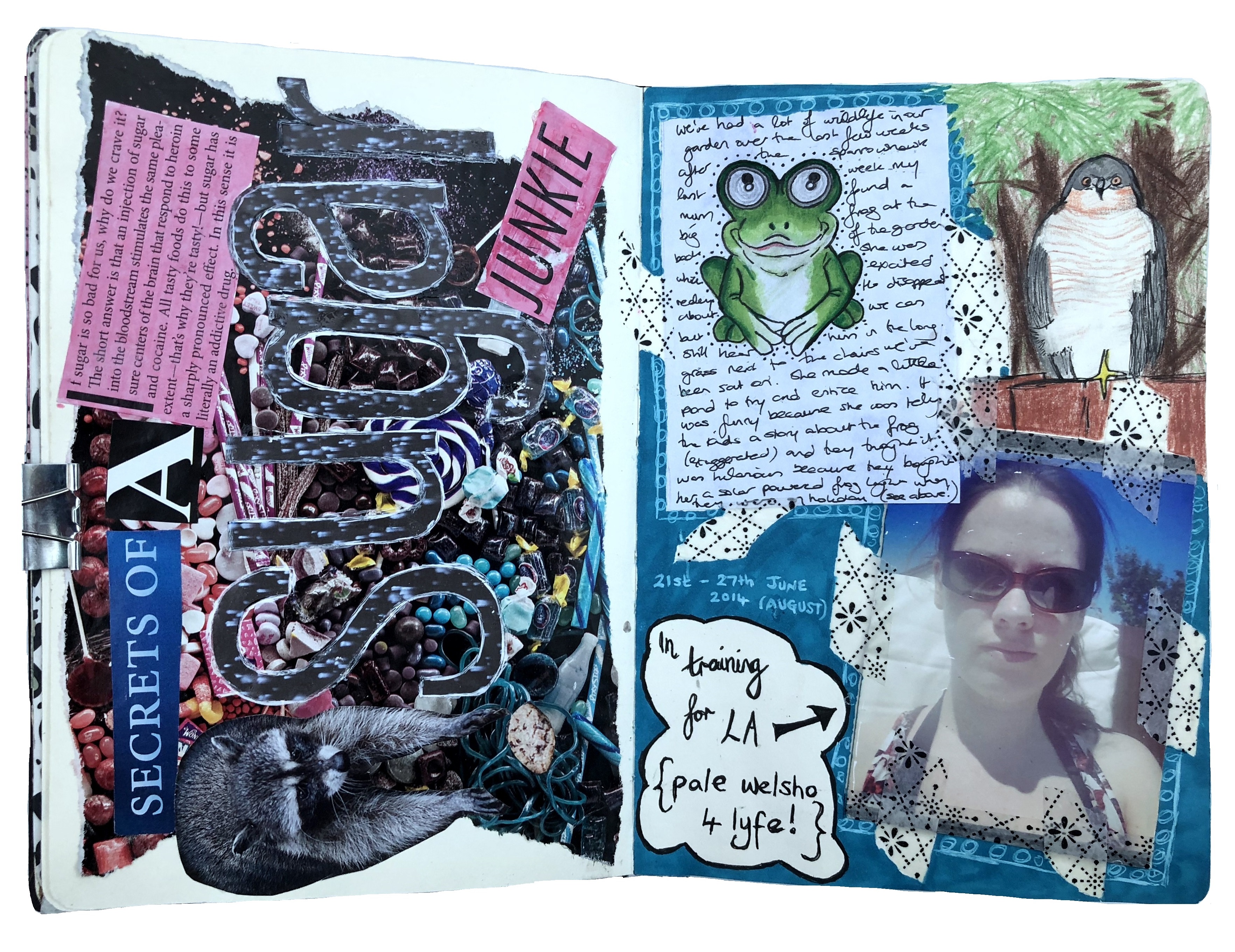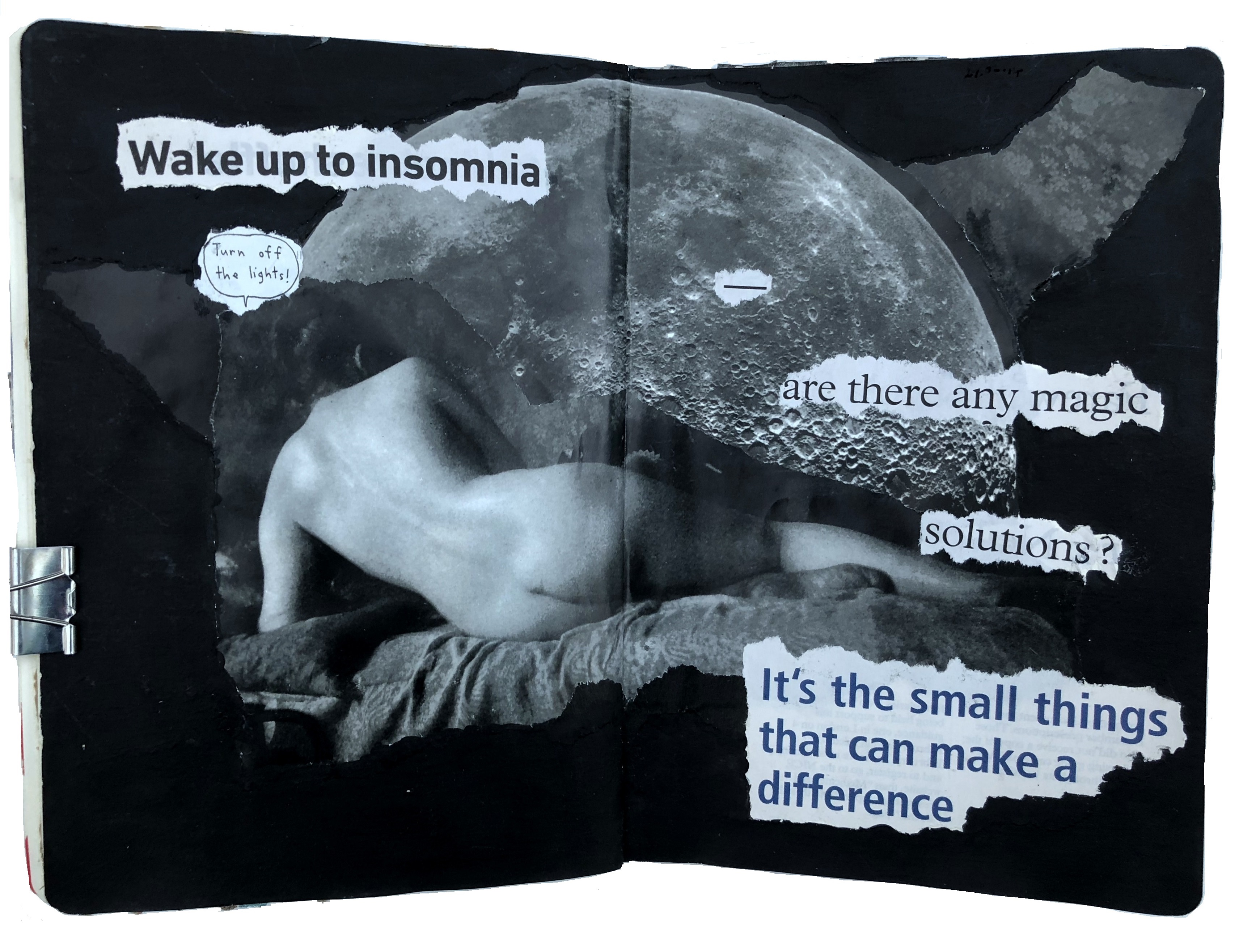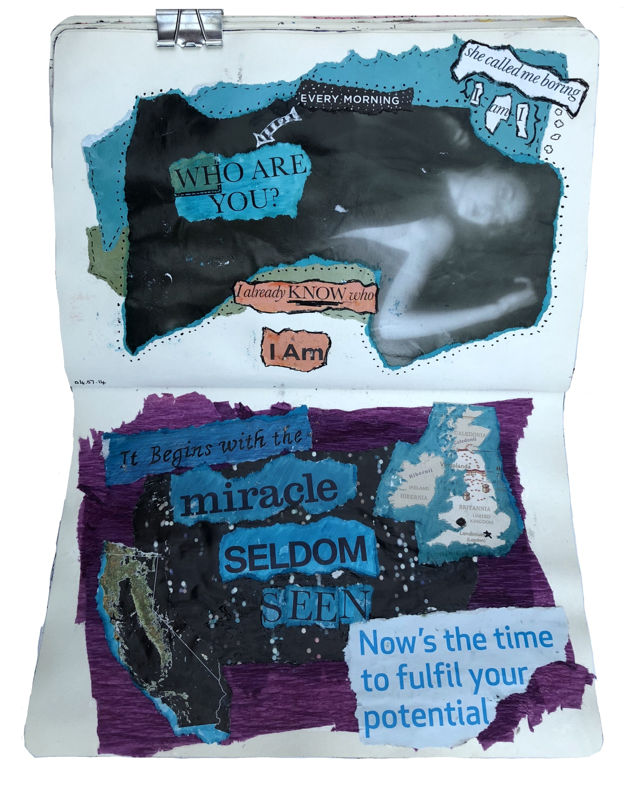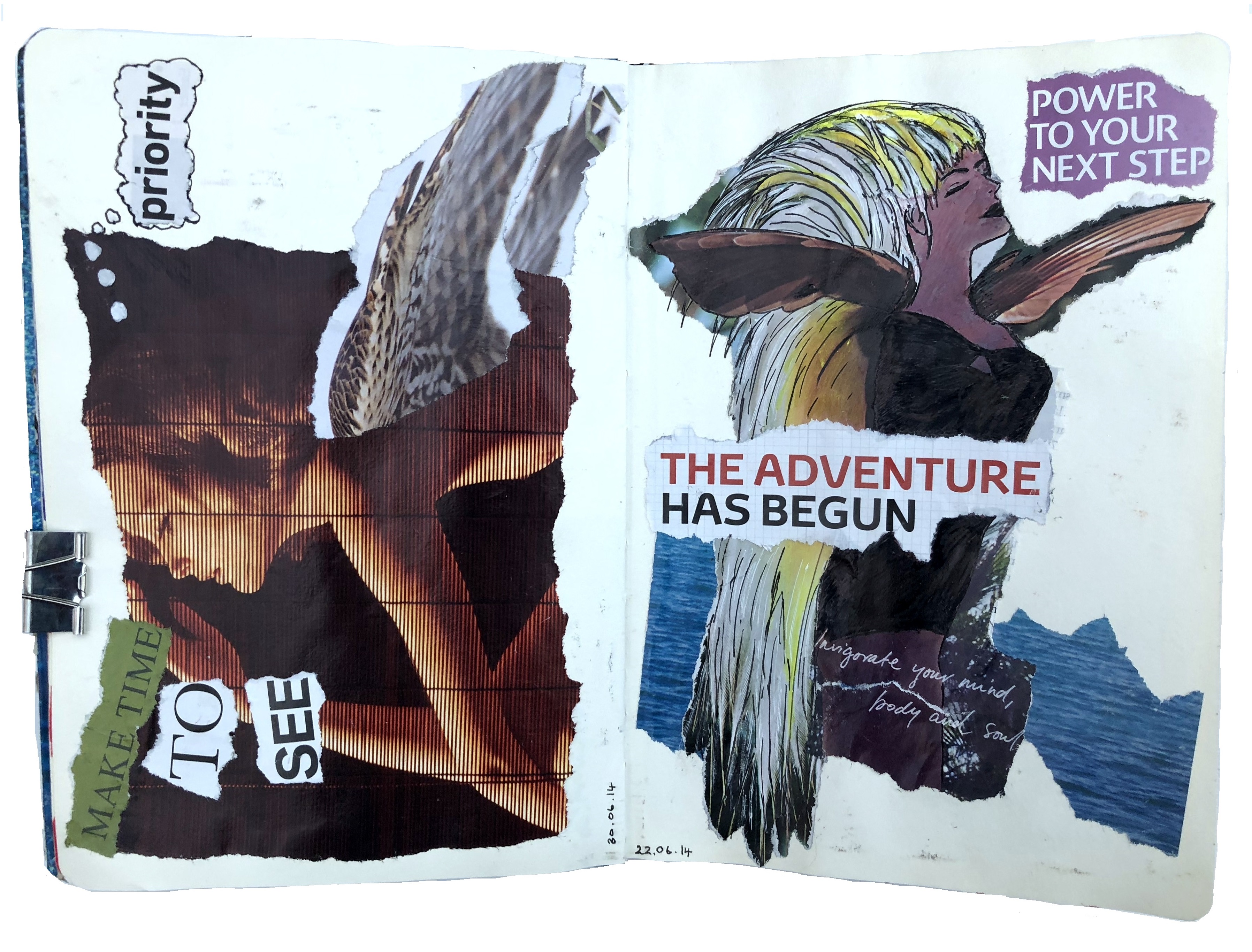 ×July 2014: A mixed media art journal collage about travel and adventure and another collage about tunneling out of a deep sleep.
