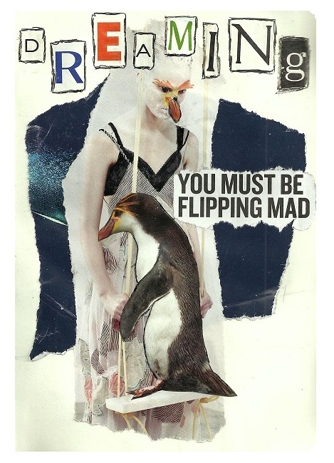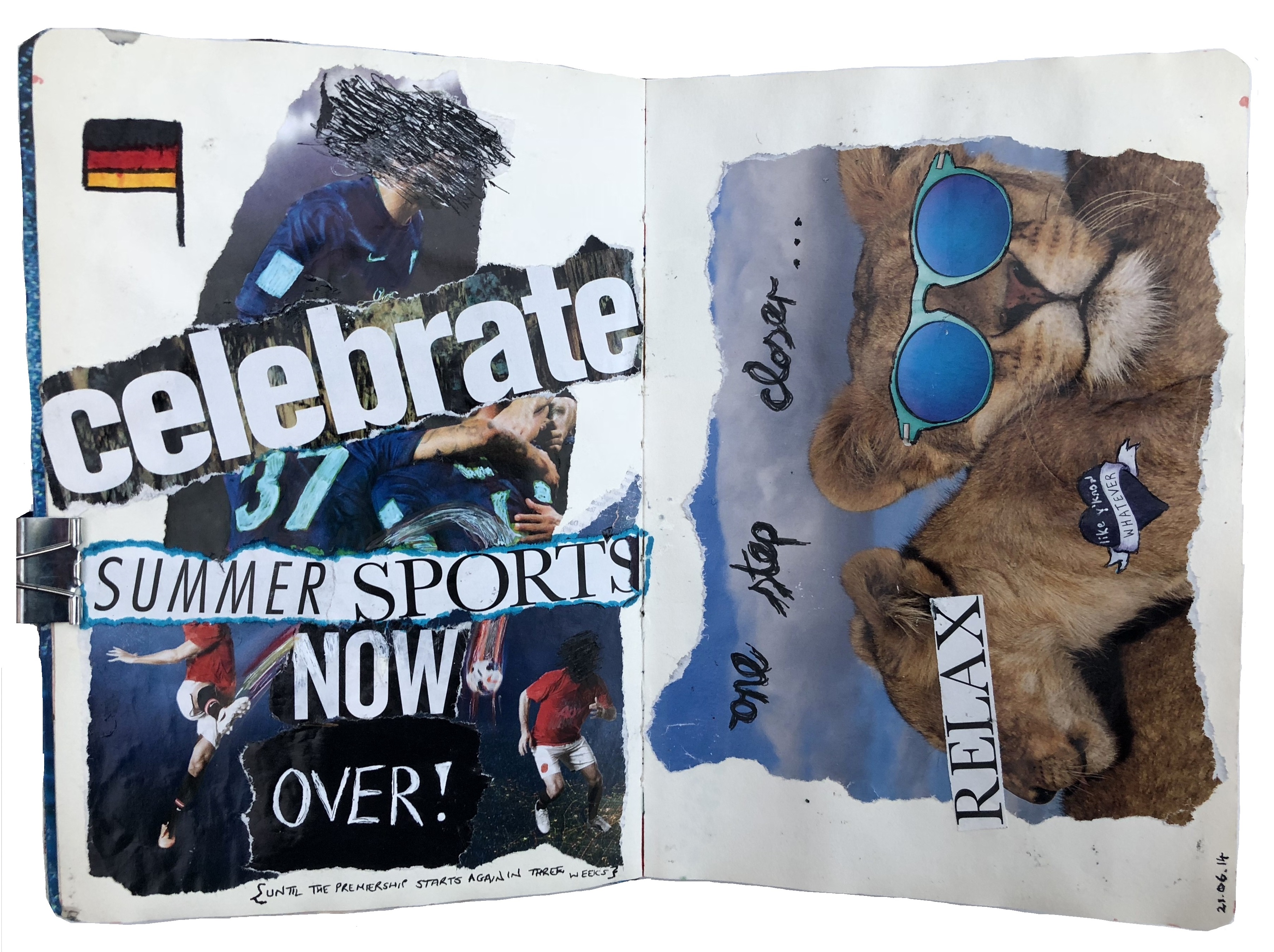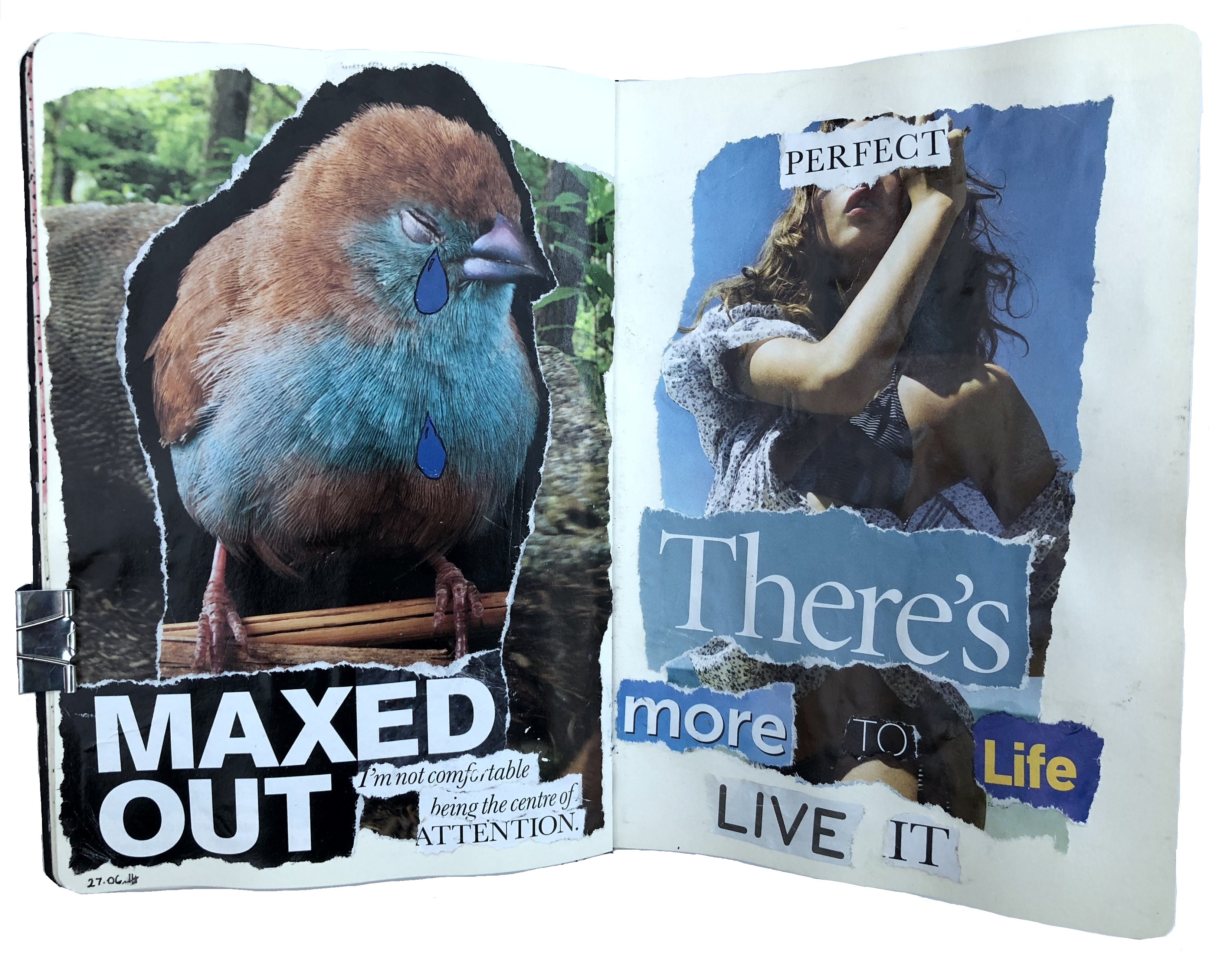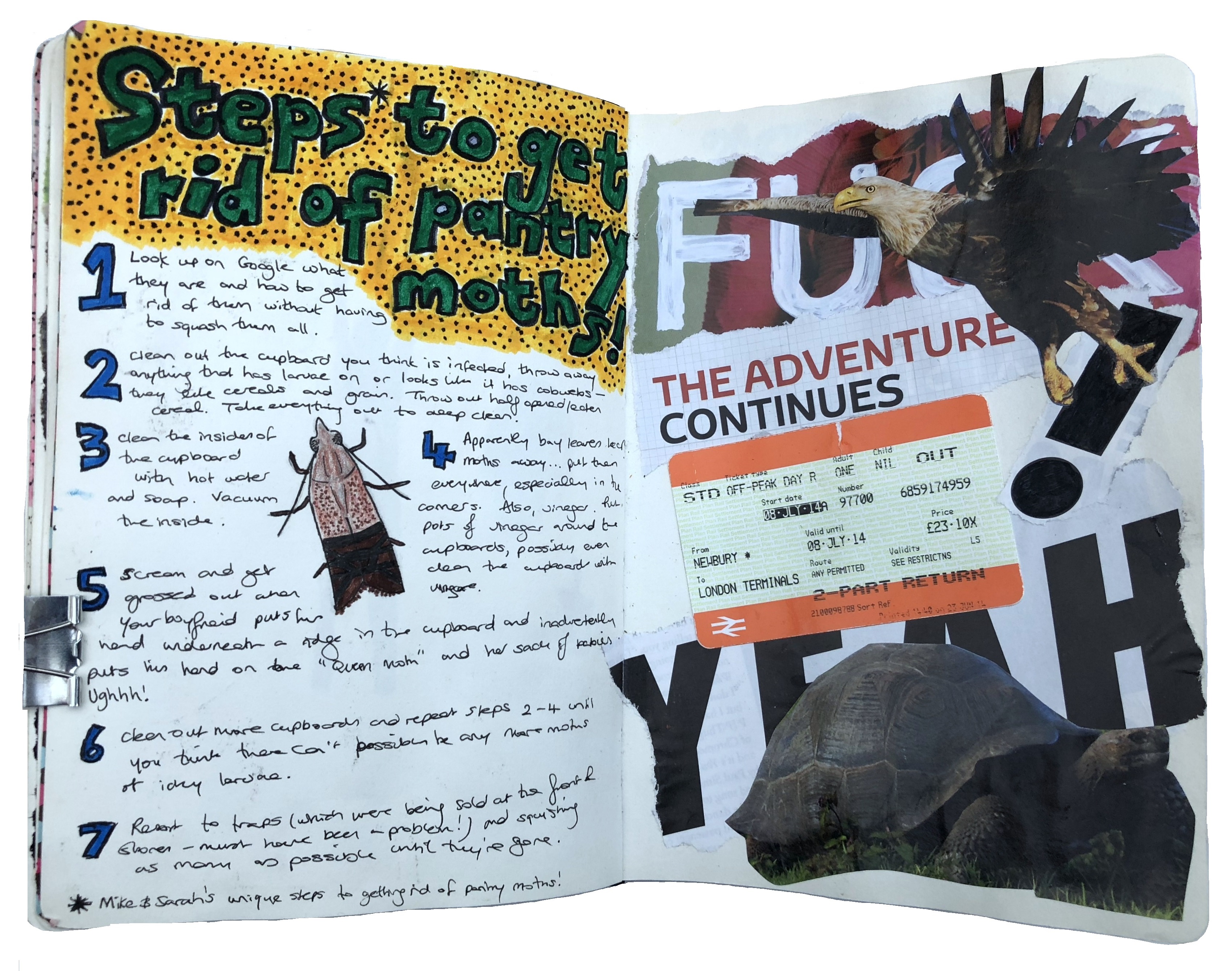×July 2014: A mixed media art journal collage about travel and adventure and another collage about tunneling out of a deep sleep.