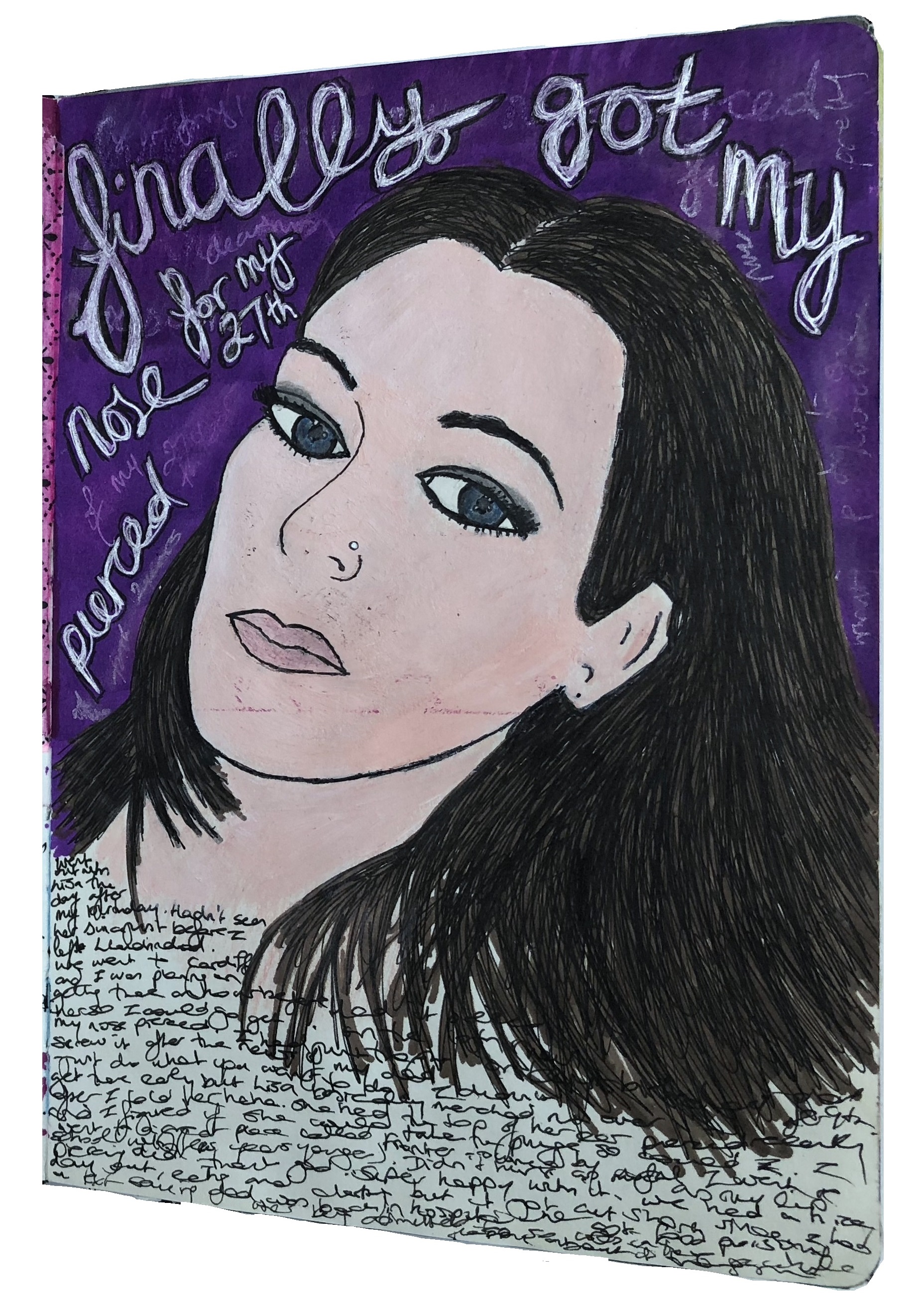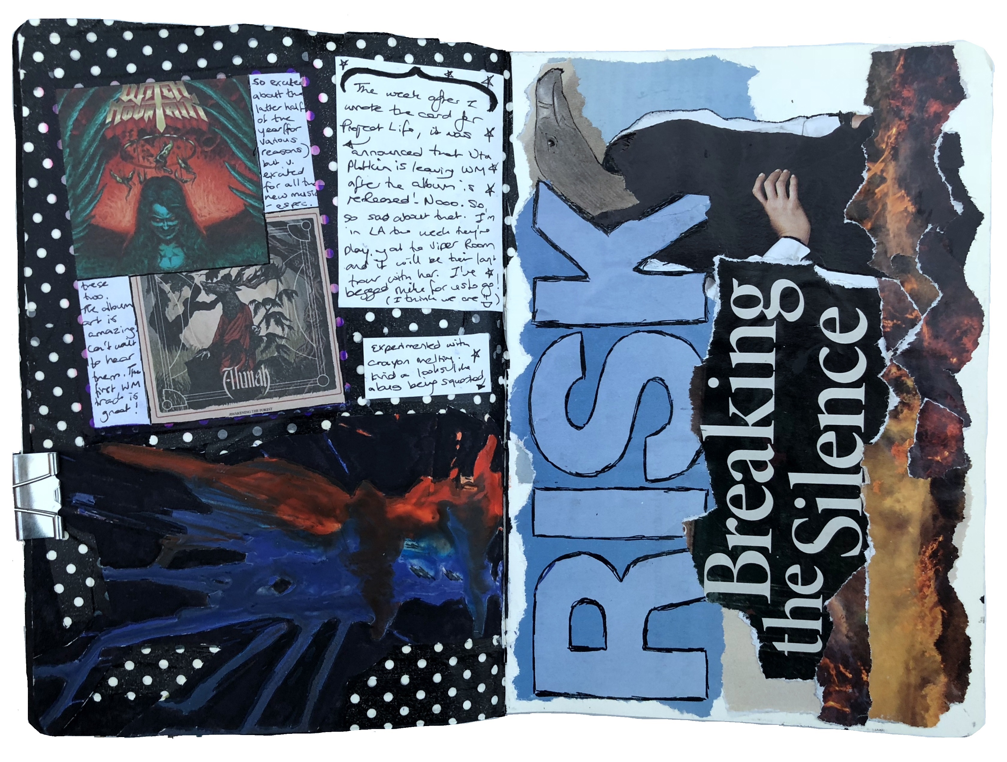 Journal: Ryman’s A5 Soft Cover Sketchbook Medium(s): Acrylic paint, ink, washi tape, black gesso, melted crayon, ephemera Status: Complete Notes: This journal documented an emotional and difficult time, I'm only sharing select pages from it. It was originally supposed to document a couple of months in Los Angeles, but I cut the trip short in April due to my dad becoming ill. My grandmother also passed away in June. I found out I had been selected for an internship in LA starting in September but I was torn about moving across the world.