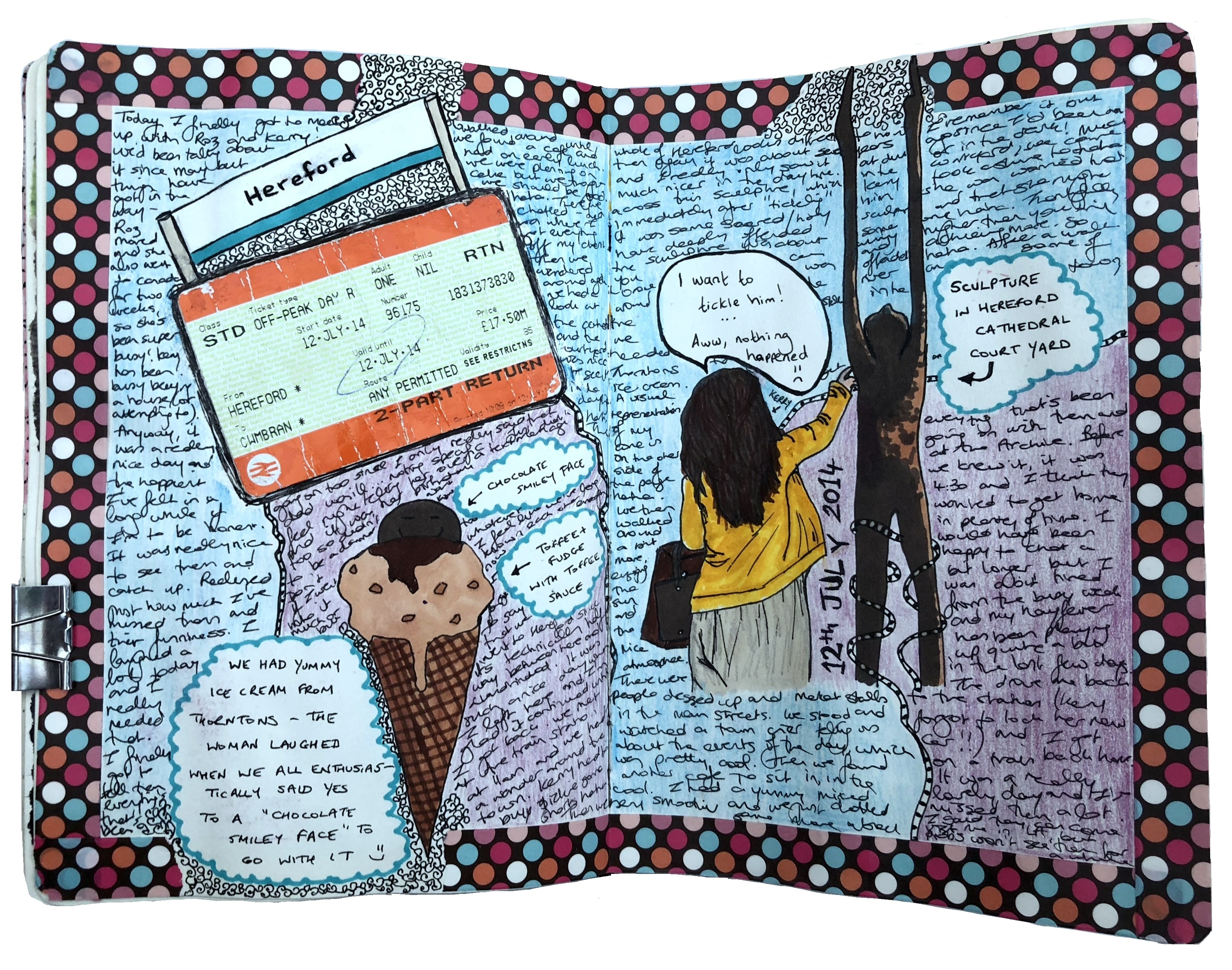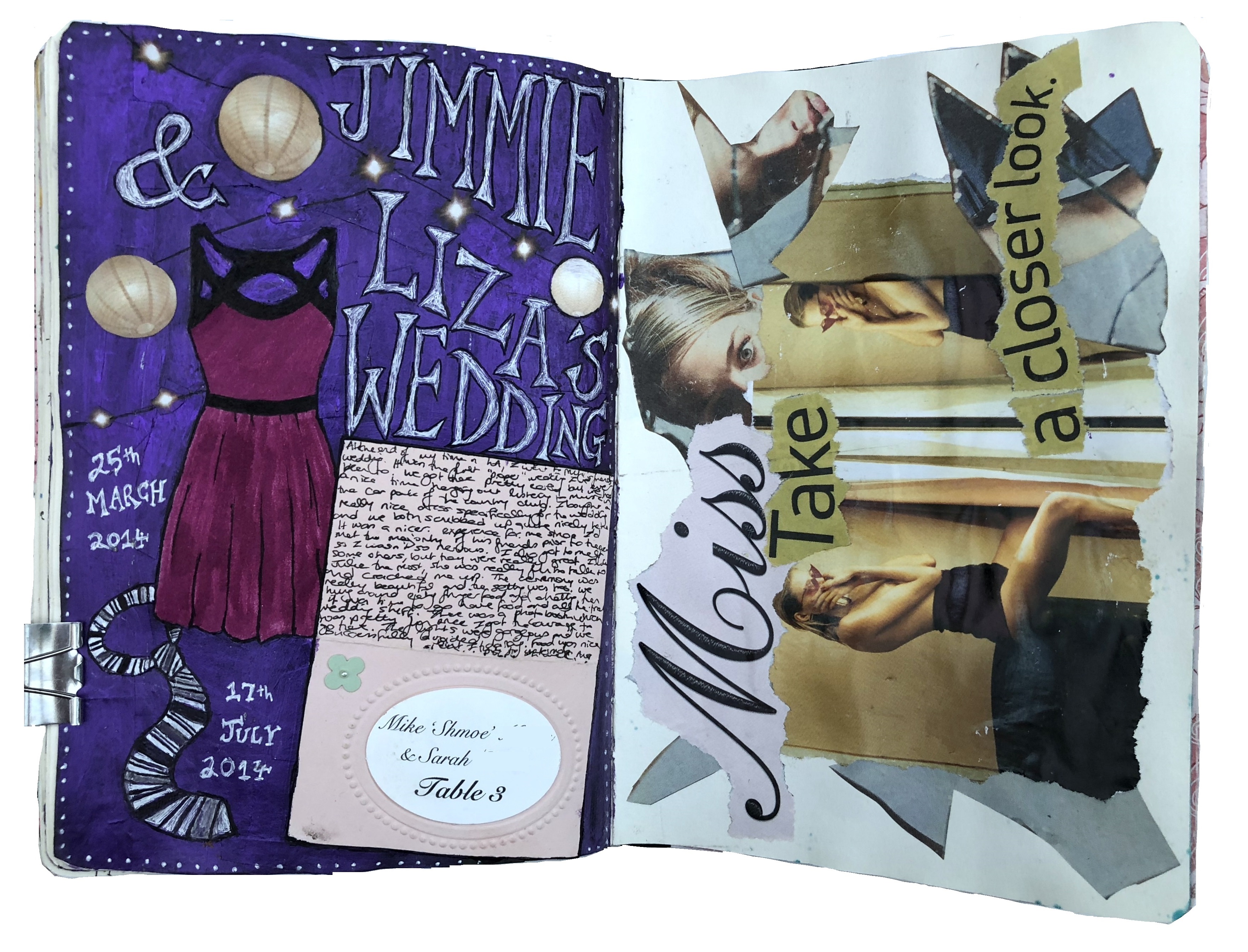 ×March 2014: A mixed media art journal collage of photographs from my 1 year anniversary and a drawing of the breakfast we had at our favorite vegetarian restaurant.