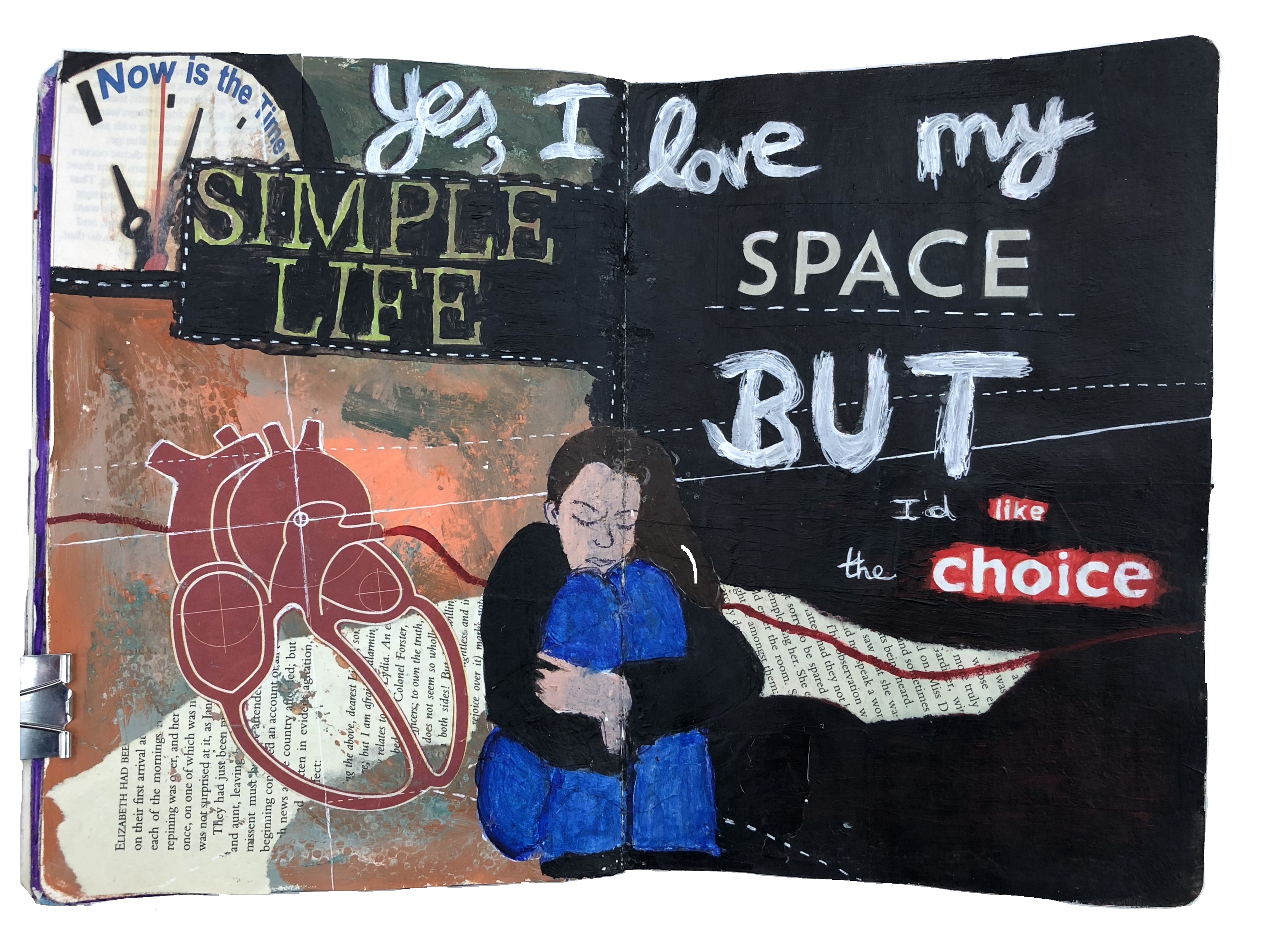 This journal documents my move to a small town in mid-Wales for a temporary job. It was my first time living alone. It explores the themes of fate, long-distance relationships, independence, loneliness, and jealousy. The journal I used was a Ryman’s A5 Soft Cover Sketchbook. The pages are organized in the order they appear in the journal.
