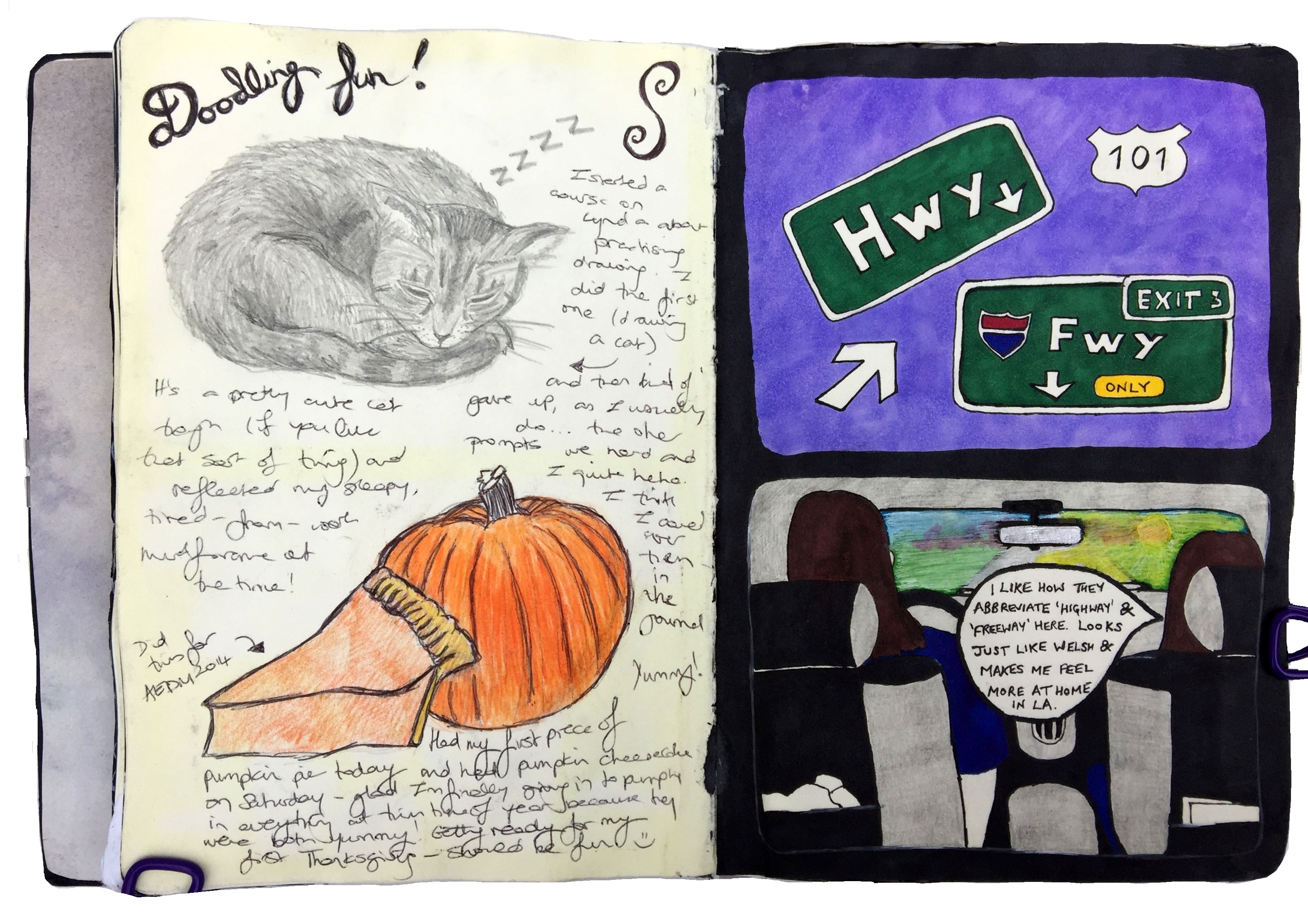 This journal documented the first six months of my move to Los Angeles for an internship starting in August 2014. The journal I used was a Ryman’s A5 Soft Cover Sketchbook. The pages are organized in the order they appear in the journal.
